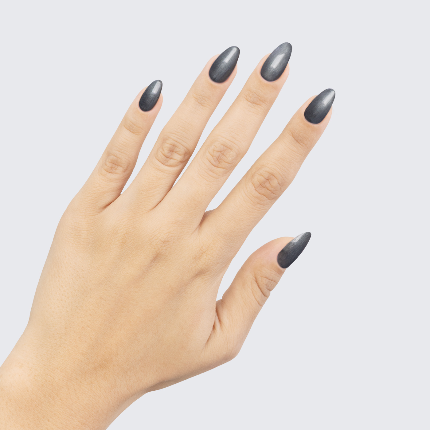 Gunmetal grey. Dark. Pearl finish. Opaque. Cool undertone.